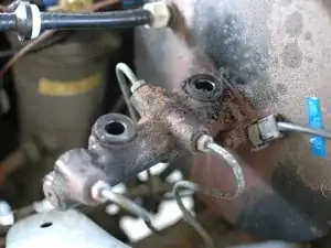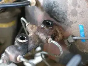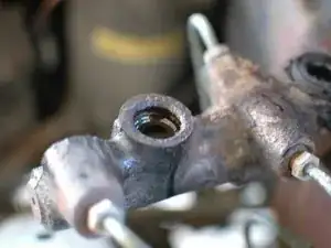 На этом фото передняя пробка снята. Аккуратно очистите область вокруг этой зоны ветошью. Не допускайте попадания грязи в главный цилиндр — очищайте так, чтобы грязь выходила, а не заходила внутрь.