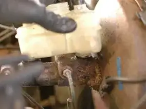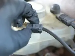 После отключения разъёмов датчиков просто вытяните бачок из главного цилиндра. Тяните строго вверх. Может потребоваться некоторое усилие. В этот момент возможно небольшое подтекание и разбрызгивание тормозной жидкости — приготовьте воду, чтобы смыть её с окрашенных поверхностей под автомобилем.