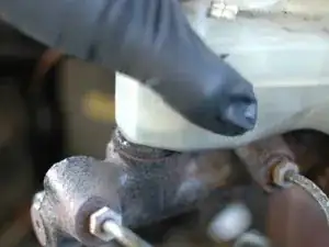 Теперь можно вставить бачок тормозной жидкости в переднее отверстие пробки. Делайте это, подводя бачок под углом к главному цилиндру.