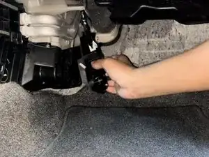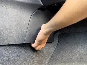 Снимите чёрную панель под торпедо со стороны пассажира, отщёлкнув две защёлки.