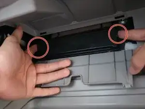 Снимите переднюю пластиковую крышку, как показано. Потяните за обе верхние защёлки пальцами.