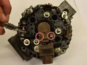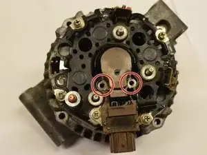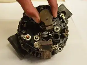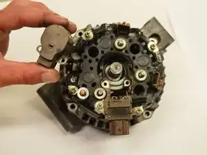 После этого вы должны увидеть внутренние компоненты генератора, в частности, сборку моста, содержащую выпрямитель, регулятор напряжения и щетки.