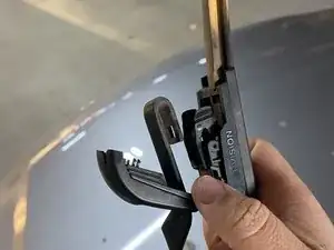 Отожмите защёлку и выведите крючок из его гнезда, сдвинув щётку вниз.