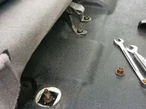 Отрегулируйте сиденье как можно дальше назад. С помощью глубокой головки на 18 мм снимите болты спереди, крепящие сиденье к полу. На моём цельном сиденье было только два болта. Если у вас сиденье 60/40 или ковшеобразные сиденья, болтов будет больше.