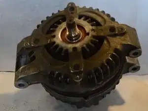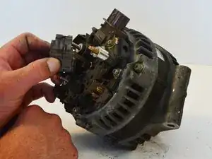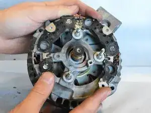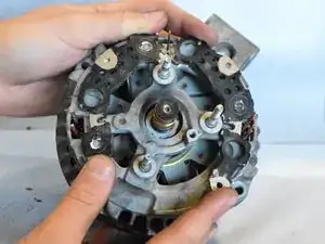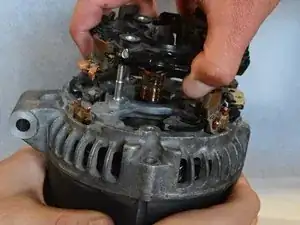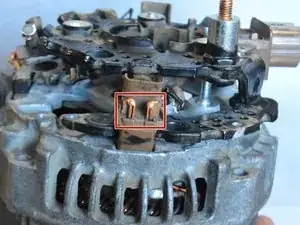 После этого вы сможете увидеть внутренние компоненты генератора, в частности мостовую сборку, содержащую выпрямитель, регулятор напряжения и щетки.