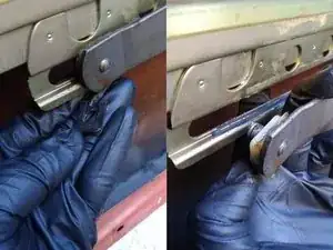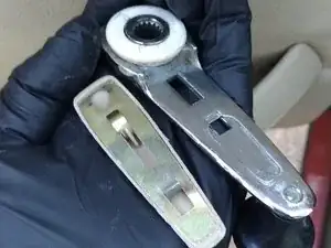 Есть прямоугольная пластиковая втулка, которая скользит по направляющей внизу стекла, она надевается на штифт первой