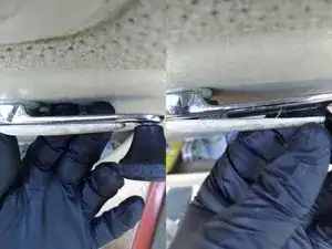 Для верхнего винта имеется хромированная накладка. Её нужно аккуратно отжать — используя пику или маленькую отвёртку, чтобы не повредить