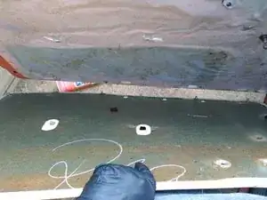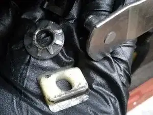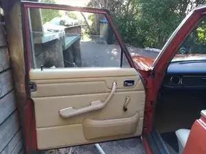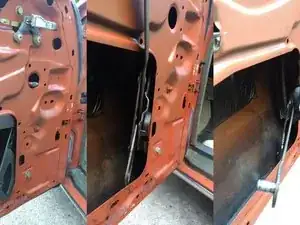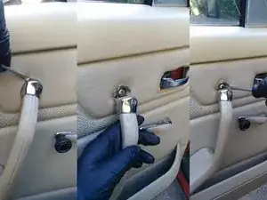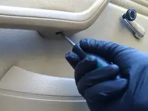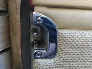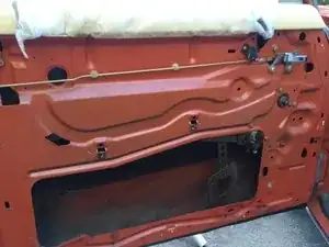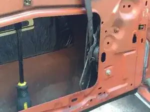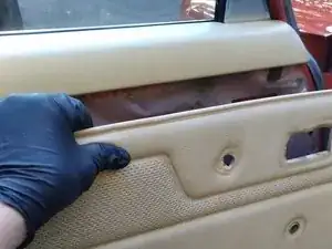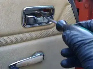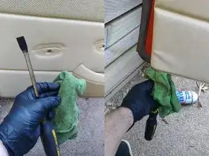 Внутренняя панель обшивки двери закреплена рядом с краем рядом толкателями; их можно поддеть пластиковой лопаткой для обшивки или, как я сделал, маленьким рычажком и тряпкой