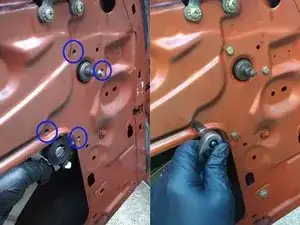 Регулятор крепится к двери четырьмя болтами (обведены синим); все они — болты с головкой 10 мм, но верхние два длиннее