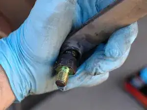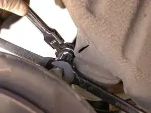 Затем используйте рожковый ключ 17 мм, чтобы ослабить нижний шарнир стойки, крепящийся к ступичному узлу.