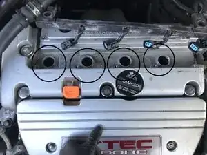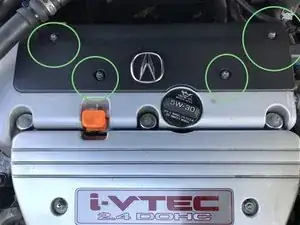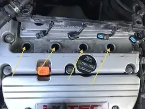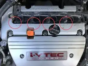 Используйте шестигранный ключ или головку на 10 мм, чтобы отвернуть четыре винта, удерживающие крышку свечей зажигания.