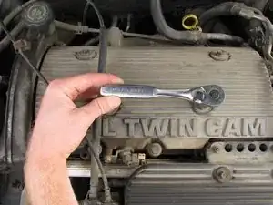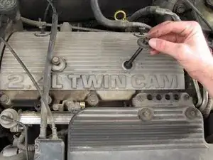 Используйте трещотку с 1/2" карданом, чтобы ослабить и снять четыре болта и шайбы с крышки свечей зажигания, на которой указано 2.4L Twin Cam.