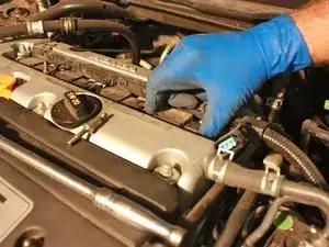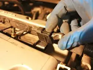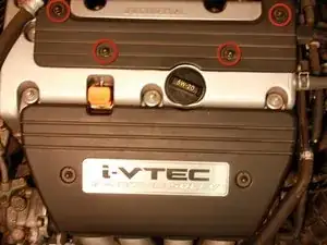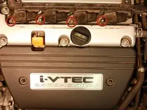 Используйте шестигранную головку 10 мм или торцевой ключ, чтобы снять четыре винта, крепящие крышку блока свечей.