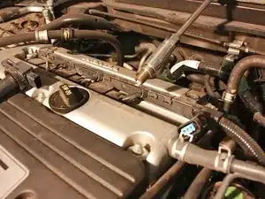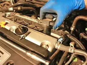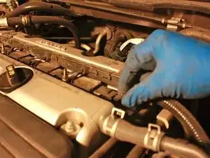 Снимите провод свечи зажигания, сжав фиксирующие защёлки по обеим сторонам и потянув провод наружу.