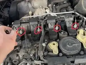 Возьмите ключ или головку на 10 мм и открутите болты, удерживающие катушки зажигания. Их должно быть 4.