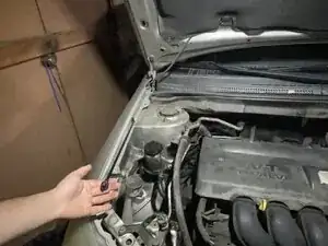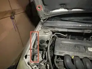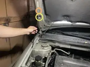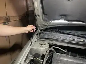 Поднимите капот, чтобы обеспечить зазор для возвращения упора капота на место. Убедитесь, что упор зафиксирован в пластиковом держателе.