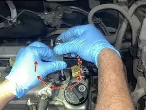 Теперь отсоедините разъёмы от каждой катушки. Сожмите фиксатор (красные стрелки показывают силу сжатия по обеим сторонам) и потяните наружу (розовая стрелка показывает направление вытягивания) от катушки, чтобы освободить проводку.