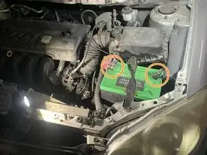 Оранжевые окружности на втором фото показывают два клеммных столба аккумулятора. Есть положительная клемма (слева на фото) и отрицательная клемма (справа на фото). Отключение отрицательной клеммы аккумулятора — стандартная практика безопасности при работе с электрическими компонентами.