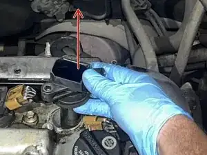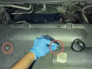 Установите пластиковую крышку и совместите отверстия со шпильками и горловиной заливной горловины масла. Поставьте два гайки 10 мм и затяните их вручную, затем доверните на 1/4 оборота трещоткой.