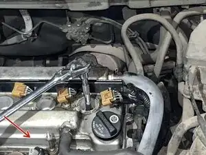 Наденьте головку на 10 мм и трещотку на любой из болтов крепления катушки и поверните трещотку против часовой стрелки, чтобы ослабить болт. Снимите все болты и положите их в безопасное место. Всего нужно снять 4 болта.