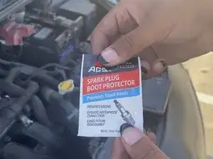Снимите белый защитный колпачок, затем извлеките защиту колодки свечи и откройте её, чтобы распределить смазку по резьбовой части новой свечи.