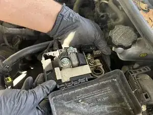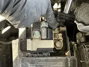 Ослабьте и снимите гайку рядом с клеммой аккумулятора, используя головку на 10 мм, надетую на ключ.