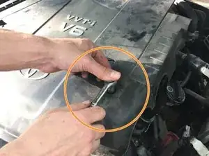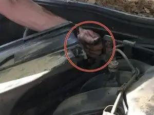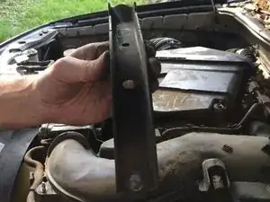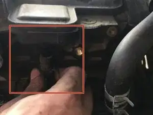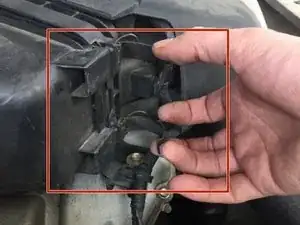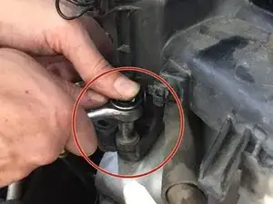 Снимите пластиковый воздушный дефлектор, открутив два болта на 10 мм при помощи головки на 10 мм и трещотки. Отложите болты в сторону.