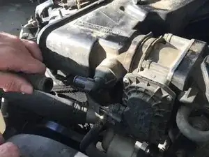 Снимите пластиковую трубку вентиляции впуска, отсоединив хомуты давления на корпусе воздушного фильтра.