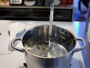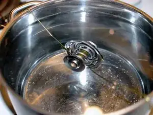Для теста подвесьте термостат на двух кусках проволоки от вешалки за ручки кастрюли. Термостат должен быть полностью погружён в воду, но не касаться дна кастрюли.