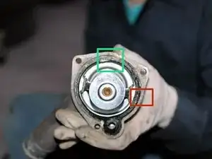 Обратите внимание на его ориентацию. Старый термостат на фото был установлен неправильно. Стрелка на термостате должна быть направлена вверх/к задней части автомобиля. Здесь она была направлена к стороне водителя.