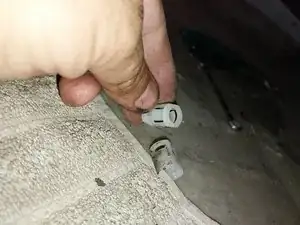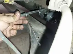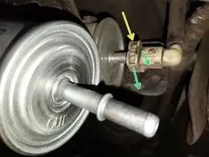 Для снятия входного штуцера с фильтра аккуратно подденьте его отвёрткой. В данном случае он зафиксирован U-образной пластиковой деталью, поскольку основание сломалось при предыдущей замене. Ослабив обе стороны U-образного зажима, можно потянуть шланг и фильтр для отсоединения.