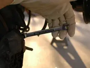 Дайте жидкости стечь, ослабив винт на два–три оборота, пока жидкость не начнёт быстро капать. Для этого используйте накидной ключ на 9 мм.