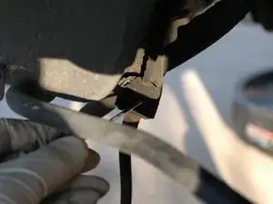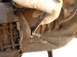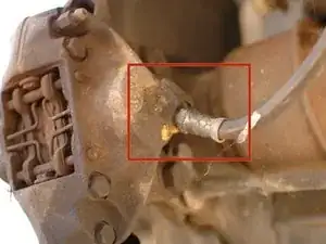 Если верхнее соединение шланга, где оно соединяется с жёсткой линией, настолько корродировано, что при попытке открутить гайка 11 мм срывается, возможно, потребуется зажать закруглённую 11 мм гайку в тисках‑зажимах, чтобы получить достаточный захват и открутить нижнюю 14 мм гайку мягкого шланга.