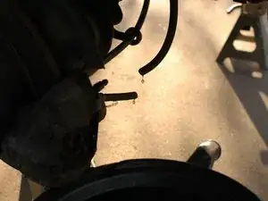Ослабьте верхнюю гайку на жёсткой линии, пока мягкий резиновый шланг не отсоединится от неё. 14 мм ключ на нижней гайке мягкого шланга удерживает шланг, чтобы он не вращался при ослаблении верхней гайки жёсткой линии.