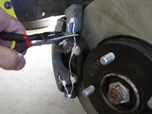 Установите удерживающую скобу, сначала вставив концы в два отверстия в суппорте, а затем используйте плоскогубцы, чтобы натянуть концы на кронштейн.