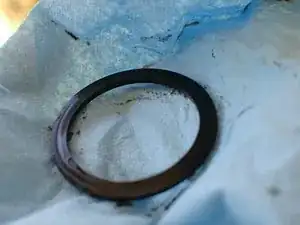 Как и уплотнение на крышке бензобака, показанное ранее, это уплотнение частично затвердело и имеет постоянную выработку. Замена на новое уплотнение, вероятно, прекратит появление масляных пятен на крышке клапанной крышки вокруг горловины.