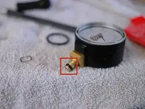 После снятия манометра аккуратно с помощью плоской отвёртки или небольшого крючка снимите чёрное уплотнительное кольцо с латунного штока манометра.