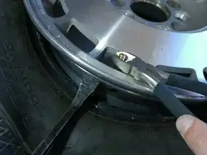 Чтобы добраться до вентиля, вам нужно разжать бортик шины. Бортик шины — это место, где резина встречается с ободом.