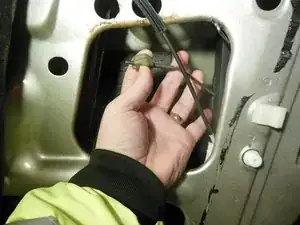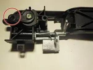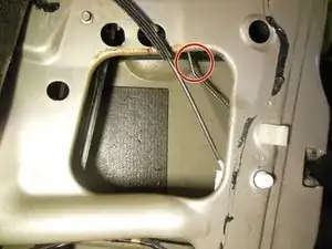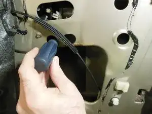 Отсоедините тягу замка двери от кронштейна ручки, вытянув пластиковый наконечник из металлической петли.