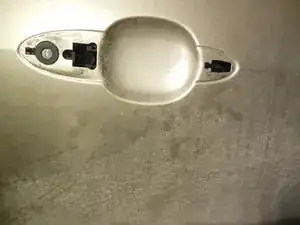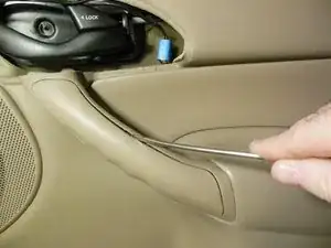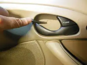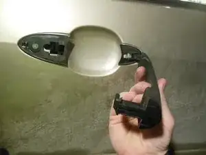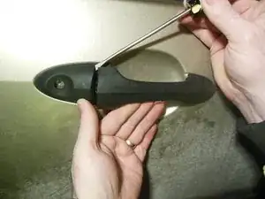 Снимите наружную дверную ручку, поддев её аккуратно плоской отвёрткой, чтобы ослабить, затем сдвиньте назад.