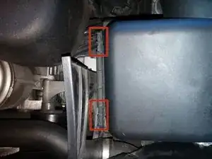 Закрепите металлические фиксаторы на правой стороне корпуса воздушного фильтра.