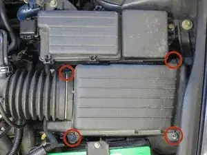 Отвинтите четыре болта в углах корпуса воздушного фильтра. Это ослабит верхнюю часть корпуса от нижней.