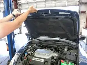 Просуньте руку под капот, прямо над логотипом Honda. Ощупайте небольшой прямоугольный рычаг. Поднимите рычаг вверх и поднимите капот.