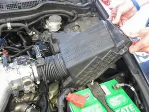 Далее отделите верхнюю часть корпуса воздушного фильтра от нижней. Для этого обеими руками возьмитесь за корпус снаружи и толкните в сторону блока двигателя, одновременно поднимая вверх.
