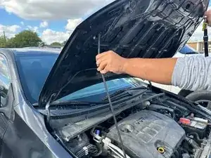Откройте капот Corolla, потянув за защёлку в нижней части приборной панели, и зафиксируйте капот опорой.