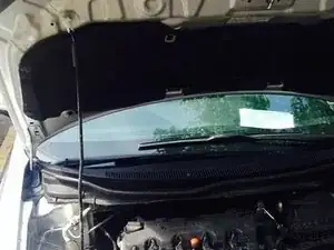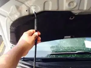 Найдите опору для удержания капота вашего автомобиля. Эта опора должна лежать на краю перед радиатором. Поднимите опору и вставьте конец в отверстие на нижней стороне капота.