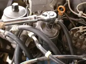 Начните с ослабления большого болта на верхней части корпуса фильтра. Существуют два варианта исполнения. Это более поздний вариант с болтом на 24 мм. Ранний вариант использует болт на 22 мм. Перед началом работы убедитесь, какой у вас.