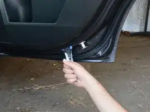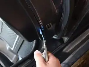 На нижней части дверной панели имеется выемка. В неё необходимо вставить инструмент для снятия дверной панели. Вместо специального инструмента можно использовать пару плоских отвёрток или скребок для краски, но есть риск повредить лакокрасочное покрытие дверной панели.