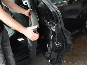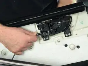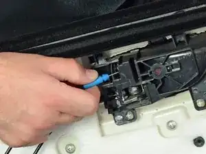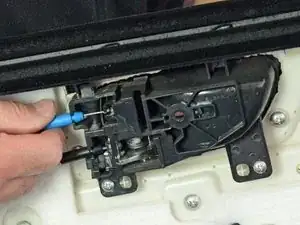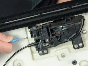 Повторите ту же процедуру с чёрным тросиком. Сначала отсоедините чёрный кожух, затем шарик, и, наконец, отведите весь тросик от дверной панели.