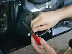 Нижняя часть дверной панели должна теперь немного ослабнуть. Повторно вставьте инструмент в нижне‑правую часть панели и потяните на себя, чтобы отсоединить вторую фиксирующую клипсу.